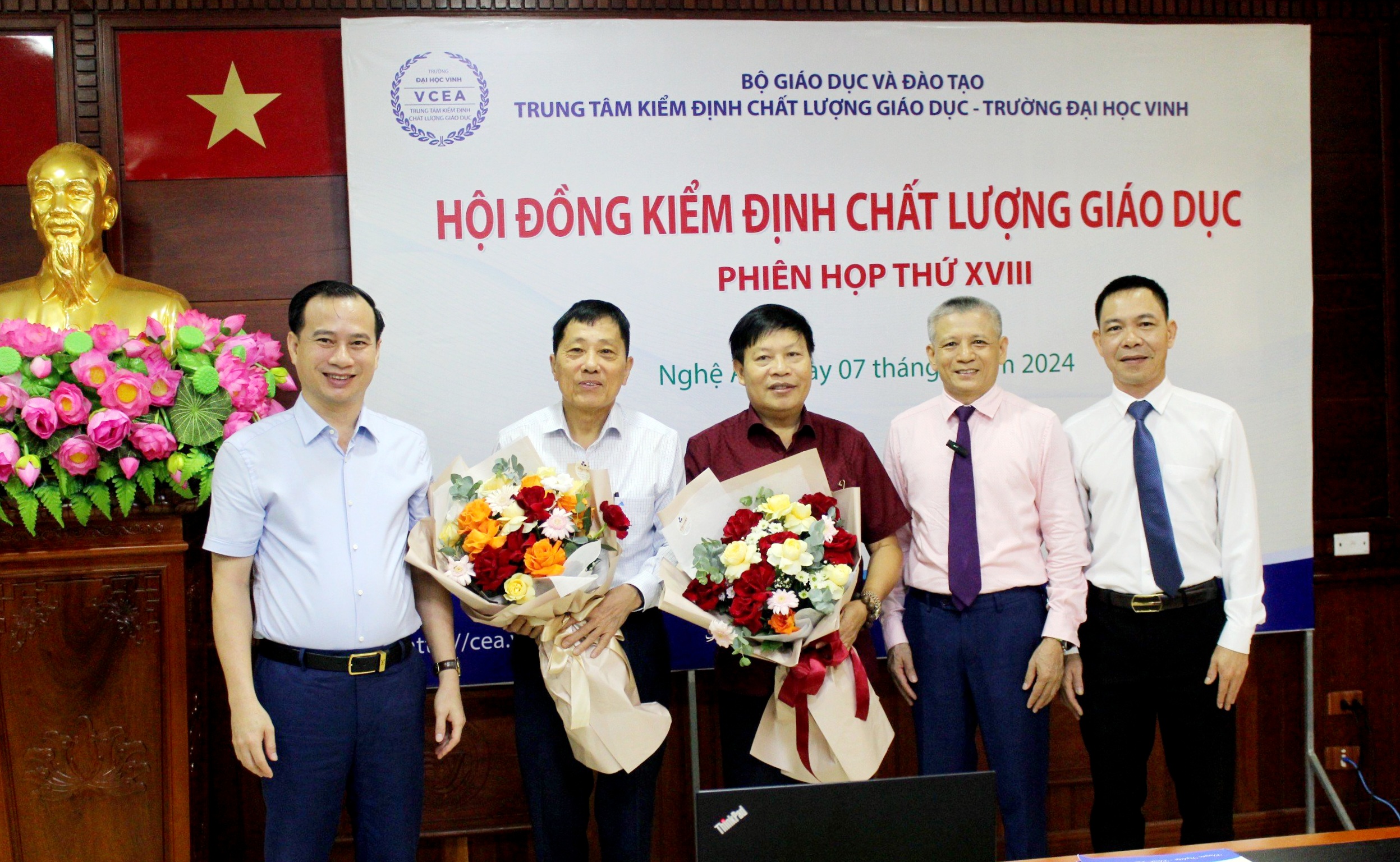 Trước khi bắt đầu phiên họp Hội đồng Kiểm định chất lượng giáo dục - Trường Đại học Vinh đã tặng hoa chúc mừng GS.TS. Đinh Xuân Khoa và GS.TS. Mai Trọng Nhuận đã được Chủ tịch nước phong tặng danh hiệu Nhà giáo Nhân dân vì đã có công lớn trong sự nghiệp giáo dục và đào tạo của dân tộc.