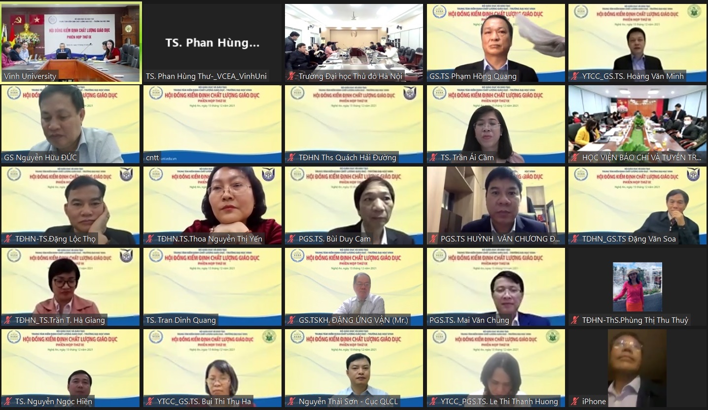 Tối ngày 15/12/2021, Hội đồng Kiểm định chất lượng giáo dục - Trung tâm Kiểm định chất lượng giáo dục - Trường Đại học Vinh (Trung tâm KĐCLGD - ĐHV) đã tiến hành phiên họp Hội đồng lần thứ IX để thẩm định kết quả đánh giá chất lượng các chương trình đào tạo (CTĐT) đã thực hiện xong quy trình đánh giá ngoài của: 03 CTĐT Đại học Thủ đô Hà Nội; 04 CTĐT Học viện Báo chí và Tuyên truyền; 01 CTĐT Đại học Y tế công cộng. Do tình hình diễn biến phức tạp của dịch bệnh Covid-19, được sự đồng ý của Bộ Giáo dục và Đào tạo, phiên họp được tổ chức bằng hình thức trực tiếp kết hợp trực tuyến.
