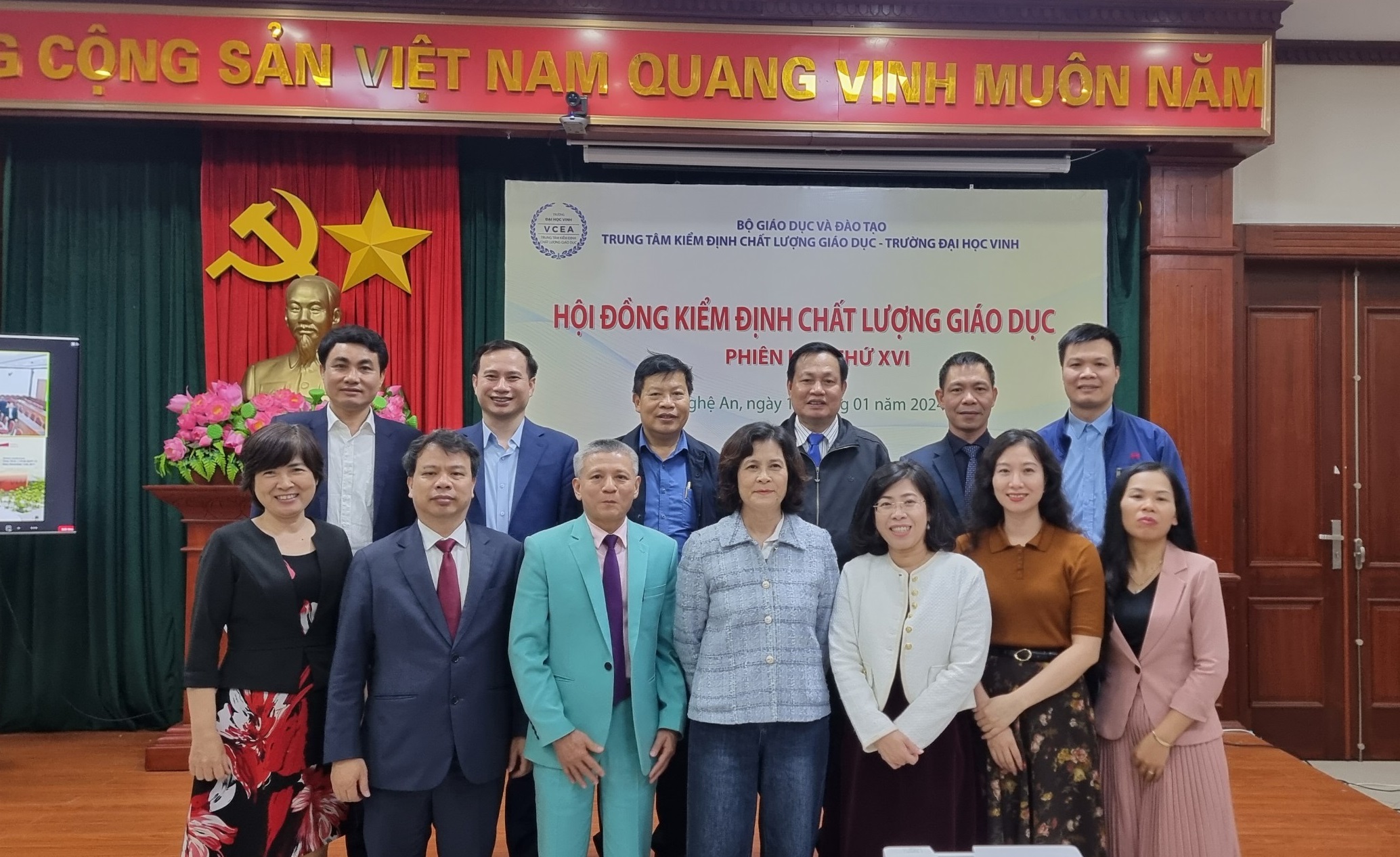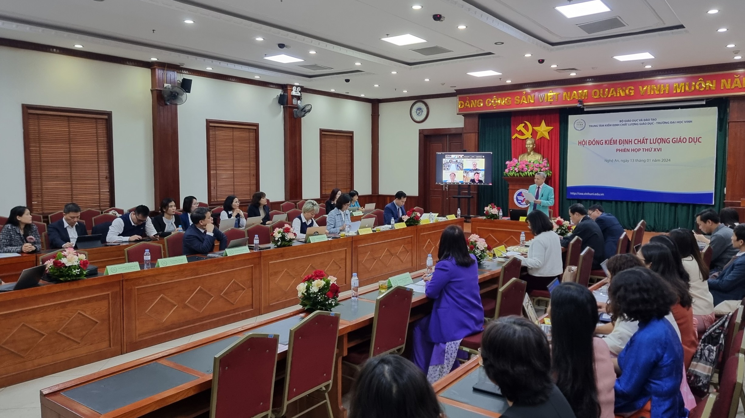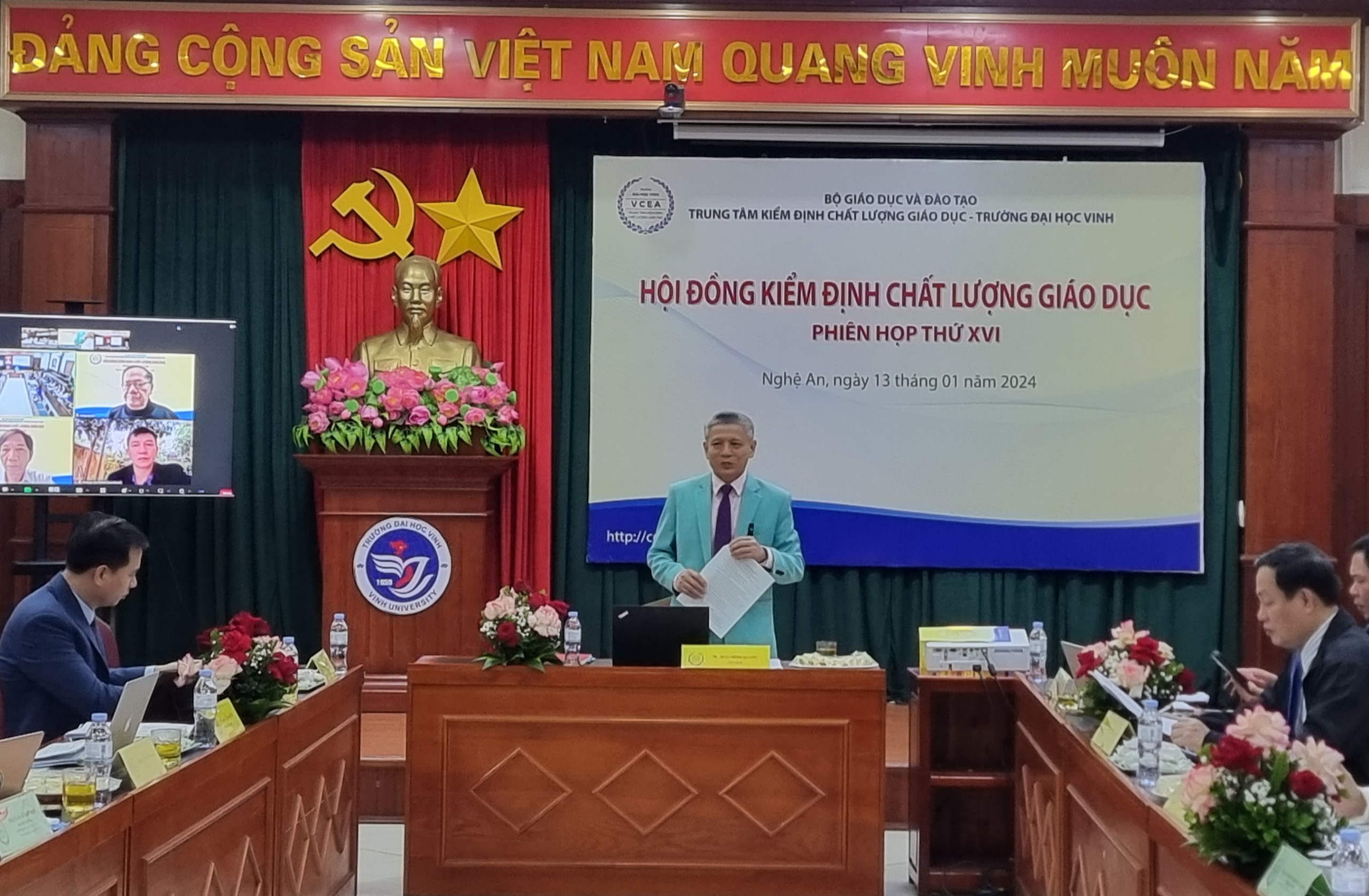 Vào ngày 13/01/2024, Trung tâm Kiểm định chất lượng giáo dục - Trường Đại học Vinh (Trung tâm) đã tổ chức phiên họp lần thứ 16 của Hội đồng kiểm định chất lượng giáo dục. Mục tiêu của cuộc họp này là thẩm định kết quả đánh giá chất lượng cho 02 cơ sở giáo dục (CSGD) và 13 chương trình đào tạo (CTĐT) thuộc 04 cơ sở giáo dục. Cuộc họp đã được tổ chức theo hình thức kết hợp, bao gồm cả giao tiếp trực tiếp và trực tuyến.
