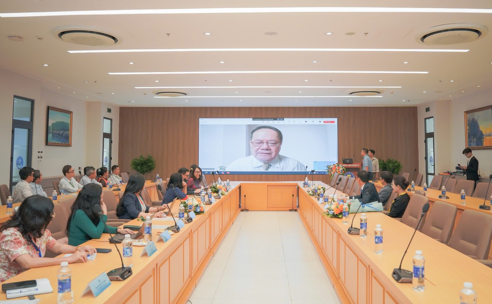 Tiếp và làm việc với Đoàn ĐGN, về phía Nhà trường có Bà Phạm Thị Minh Nguyệt - Phó Chủ tịch Điều hành Trường Đại học Văn Hiến; PGS.TS. Nguyễn Minh Đức - Thành viên Hội đồng Trường - Hiệu trưởng; PGS.TS. Trần Văn Thiện - Thành viên Hội đồng Trường - Hiệu trưởng danh dự; các Phó Hiệu trưởng; các Giám đốc điều hành; các thành viên Hội đồng tự đánh giá các CTĐT cùng đại diện lãnh đạo các đơn vị, các đơn vị có CTĐT được đánh giá trong đợt khảo sát lần này.