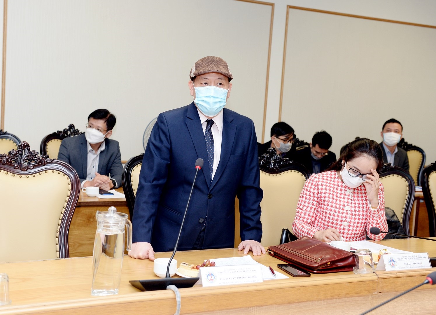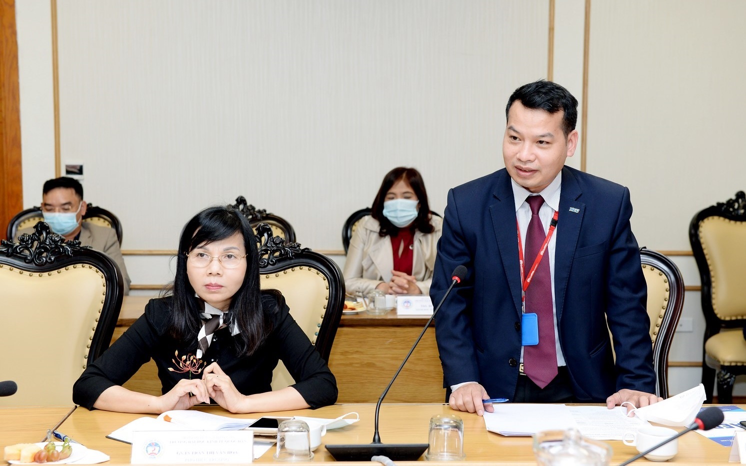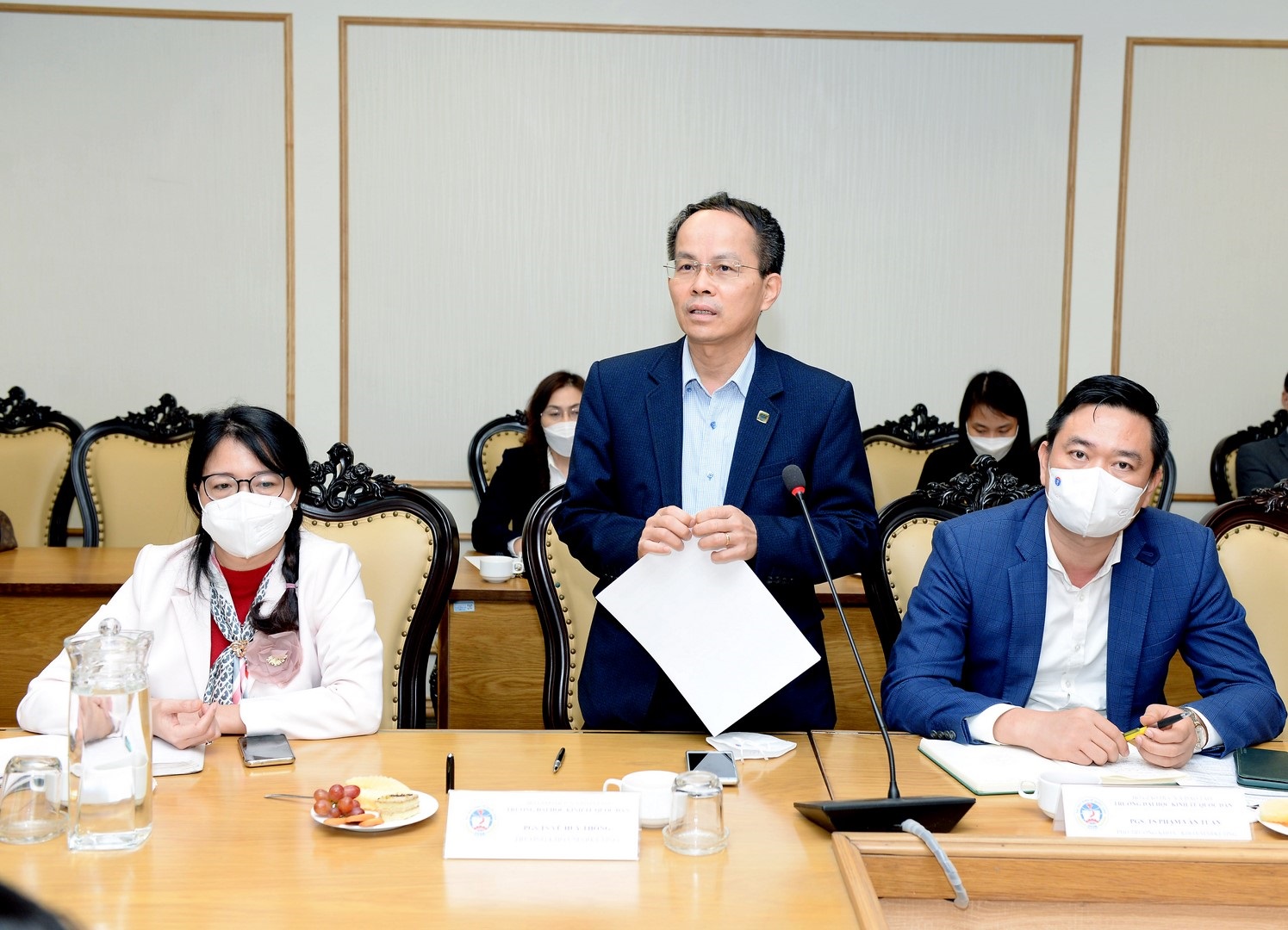 Tiếp và làm việc với Đoàn ĐGN, về phía Đại học Kinh tế Quốc dân có PGS.TS Phạm Hồng Chương – Hiệu trường; PGS.TS Bùi Đức Thọ - Bí thư Đảng ủy, Chủ tịch Hội đồng trường; GS.TS Trần Thị Vân Hoa - Phó Hiệu trưởng; cùng đại diện lãnh đạo các đơn vị trong Nhà trường.