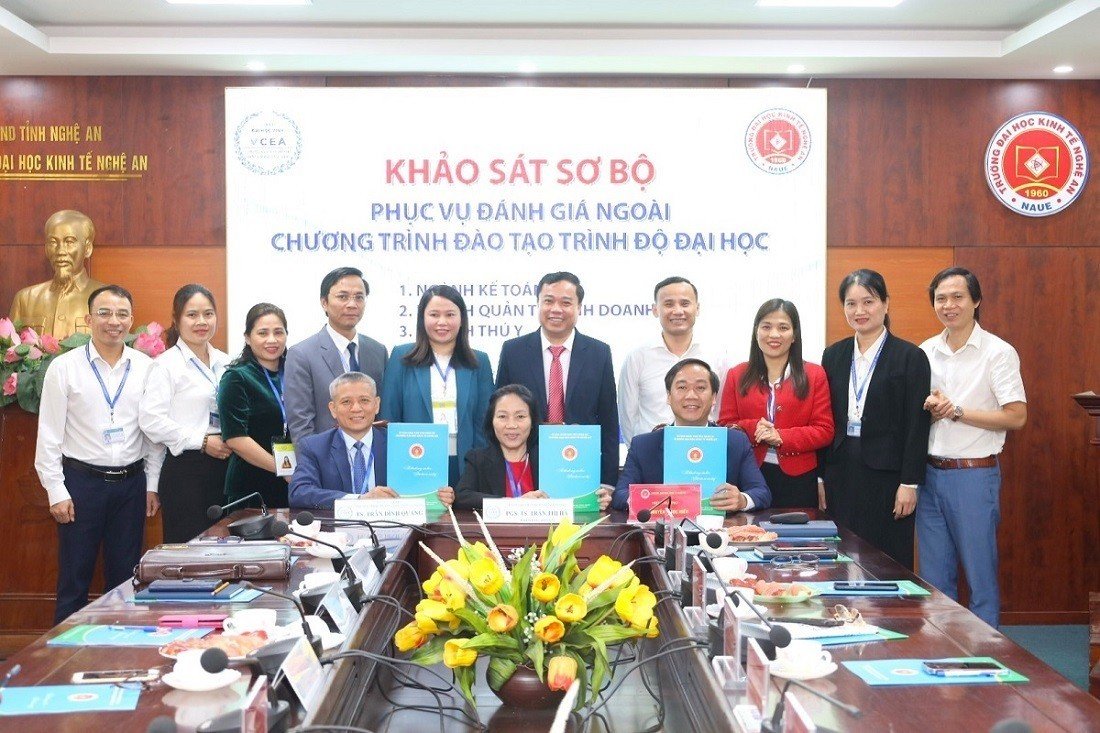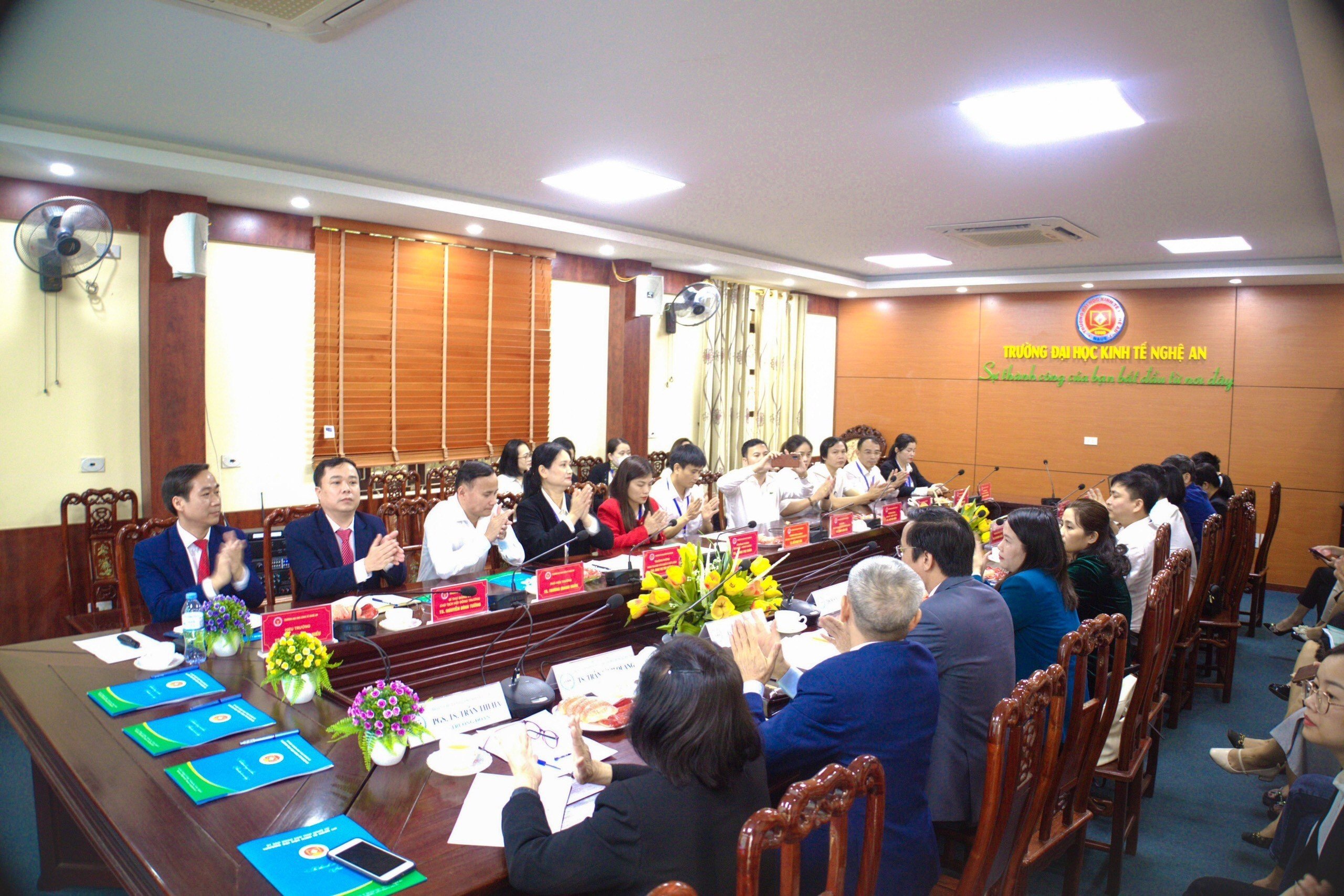 Tiếp và làm việc với Đoàn ĐGN, về phía Đại học Kinh tế Nghệ An có TS. Nguyễn Đình Tường - Bí thư Đảng ủy, Chủ tịch Hội đồng trường; TS. Nguyễn Ngọc Hiếu - Hiệu trưởng Nhà trường, Chủ tịch Hội đồng tự đánh giá; TS. Trương Quang Ngân - Phó Hiệu trưởng Nhà trường; đại diện Lãnh đạo các phòng chức năng; Lãnh đạo các Khoa cùng các thành viên Hội đồng Tự đánh giá, Ban thư ký và các cán bộ đầu mối phục vụ đánh giá chất lượng 03 chương trình đào tạo.
