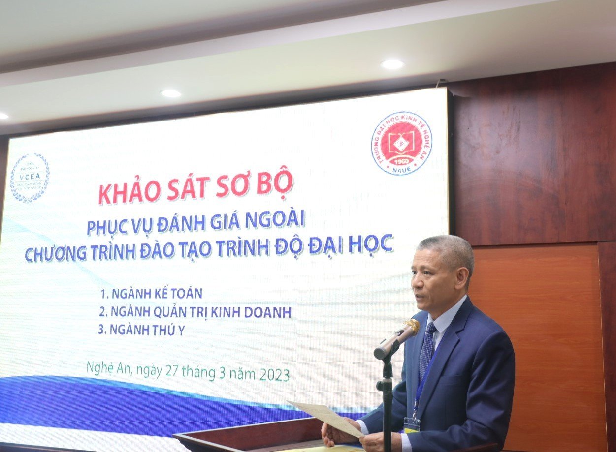 Sáng ngày 27/3/2023, Đoàn đánh giá ngoài (ĐGN) của Trung tâm Kiểm định chất lượng giáo dục - Trường Đại học Vinh (Trung tâm) đã thực hiện khảo sát sơ bộ phục vụ ĐGN 03 chương trình đào tạo trình độ đại học ngành: Kế toán; Quản trị kinh doanh và Thú y của Trường Đại học Kinh tế Nghệ An.
