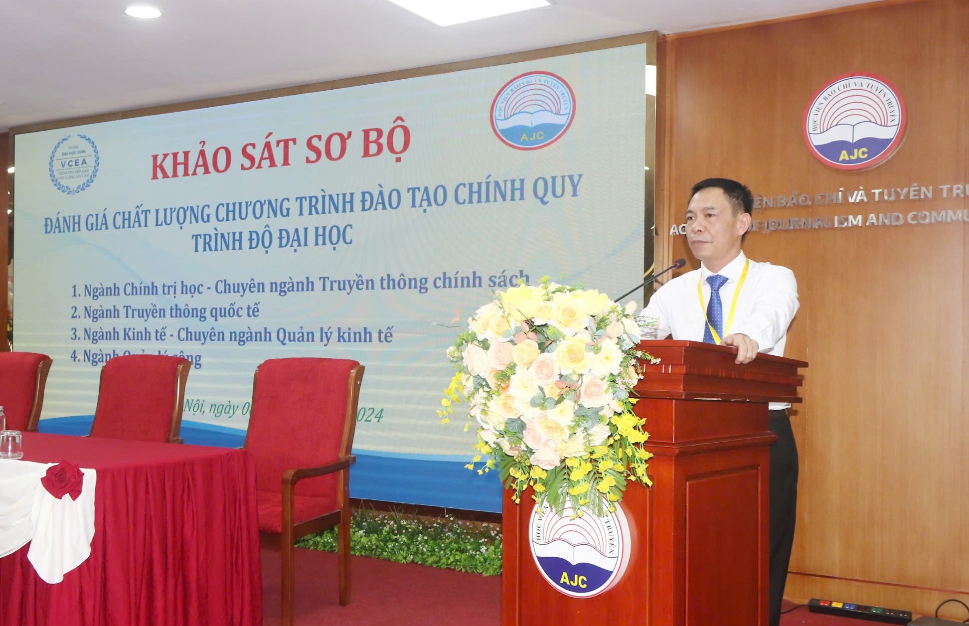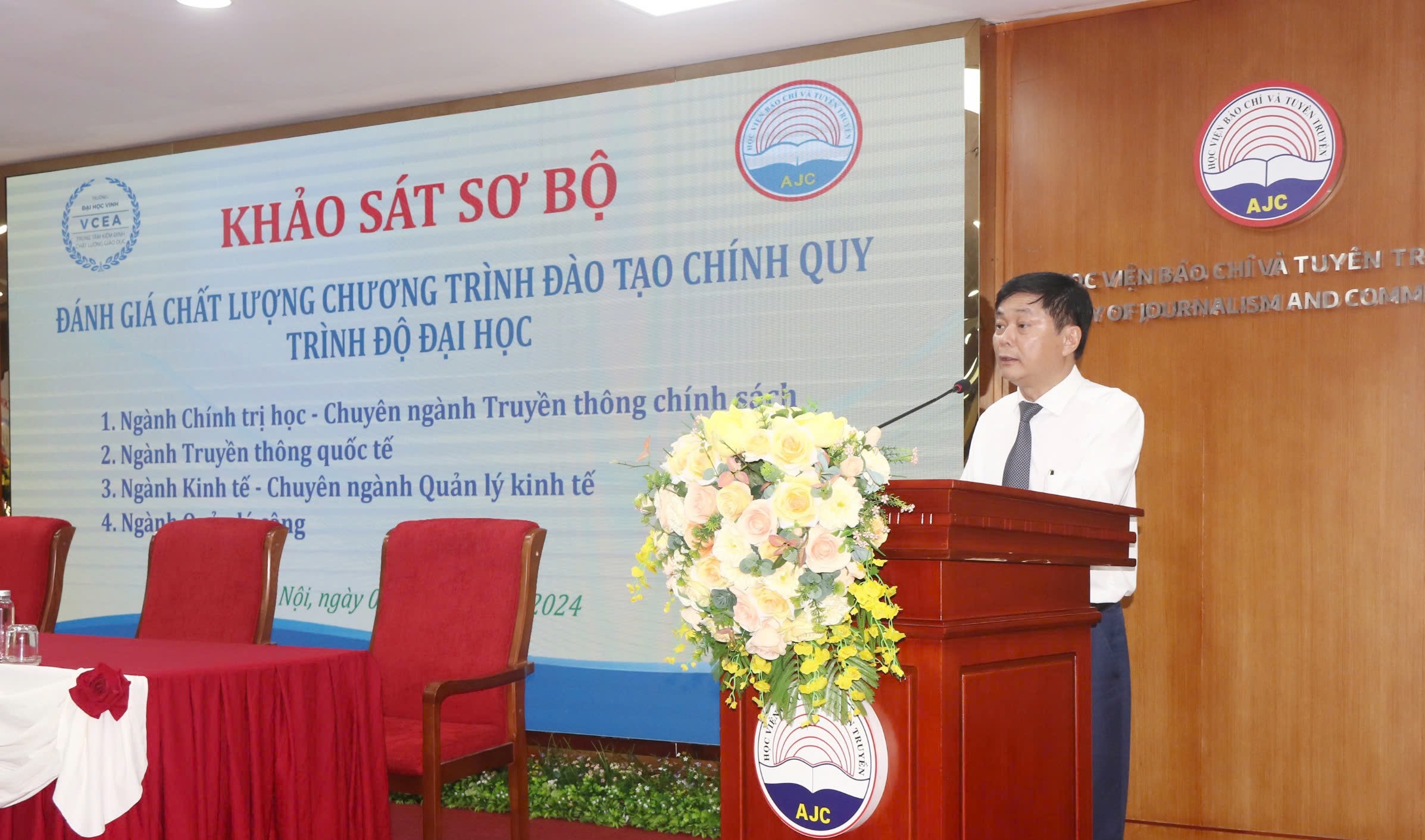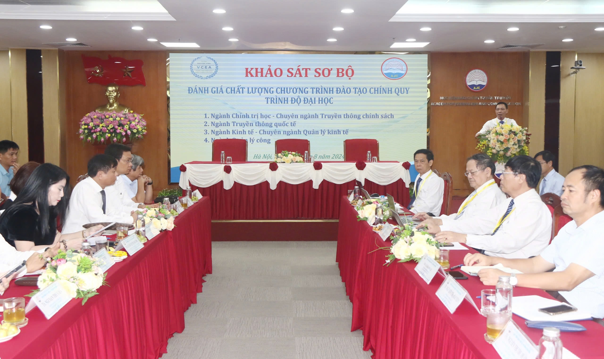 Tại buổi khảo sát sơ bộ, PGS.TS. Phạm Minh Sơn - Giám đốc Học viện đã phát biểu và nhấn mạnh một số điểm chính: Với mục tiêu nâng cao chất lượng đào tạo, năm 2024 Học viện đã quyết định tiếp tục hoạt động kiểm định chất lượng đối với 4 chương trình đào tạo: chuyên ngành Truyền thông chính sách; ngành Truyền thông quốc tế; chuyên ngành Quản lý kinh tế; ngành Quản lý công. Trong 1 năm qua, Nhà trường đã nghiêm túc trong công tác tự đánh giá và chuẩn bị đầy đủ các báo cáo tự đánh giá, danh mục minh chứng, điều kiện cơ sở vật chất cần thiết. Nhà trường đã sẵn sàng để phục vụ cho đợt khảo sát chính thức tới đây.