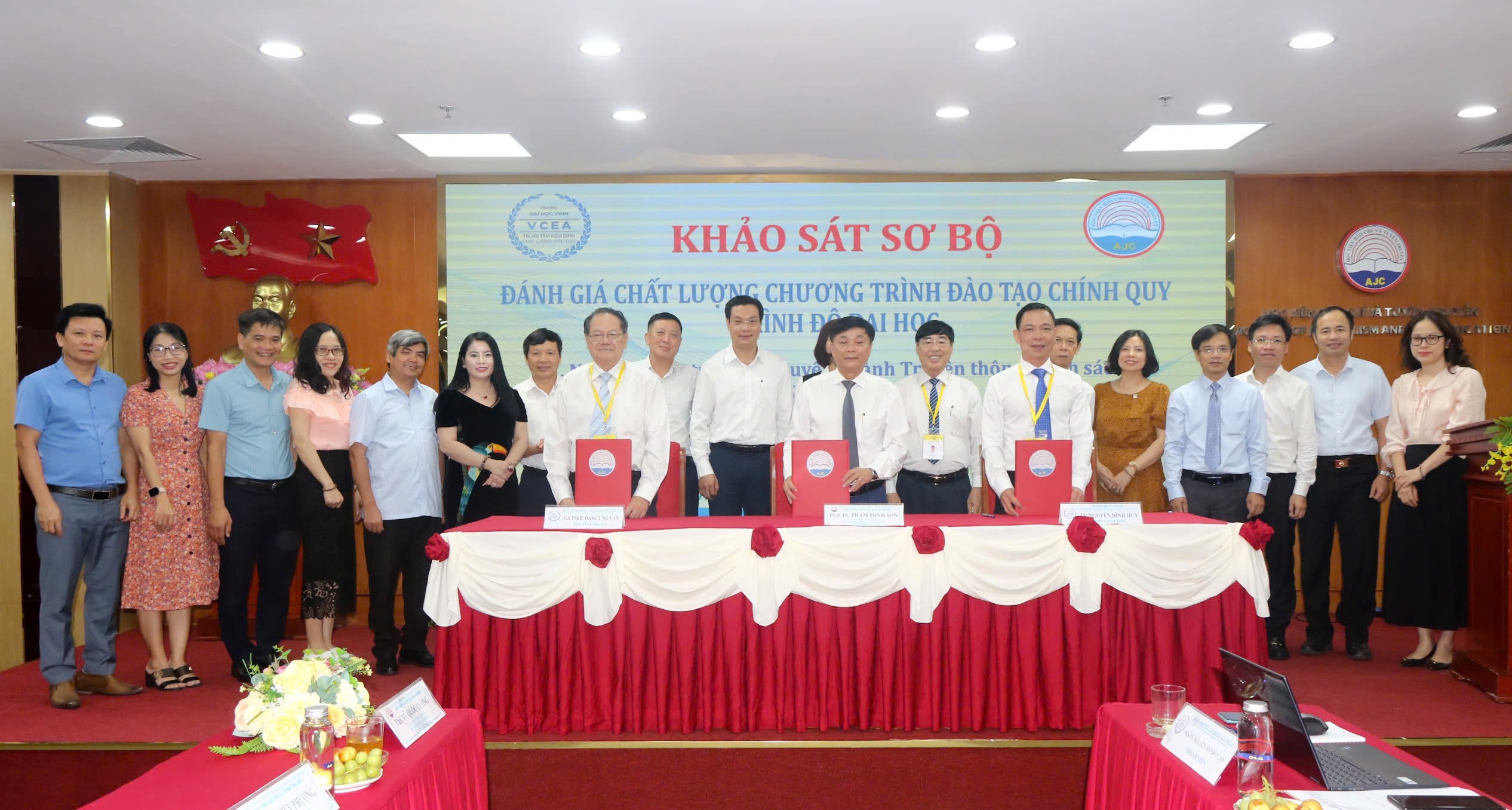 Kết thúc buổi làm việc TS. Nguyễn Đình Huy – Phó Giám đốc Trung tâm và PGS.TS. Phạm Minh Sơn - Phó Bí thư Đảng ủy, Giám đốc Học viện và GS.TSKH. Đặng Ứng Vận - Trưởng đoàn đánh giá ngoài đã ký kết Biên bản ghi nhớ sau khảo sát sơ bộ 04 chương trình đào tạo.