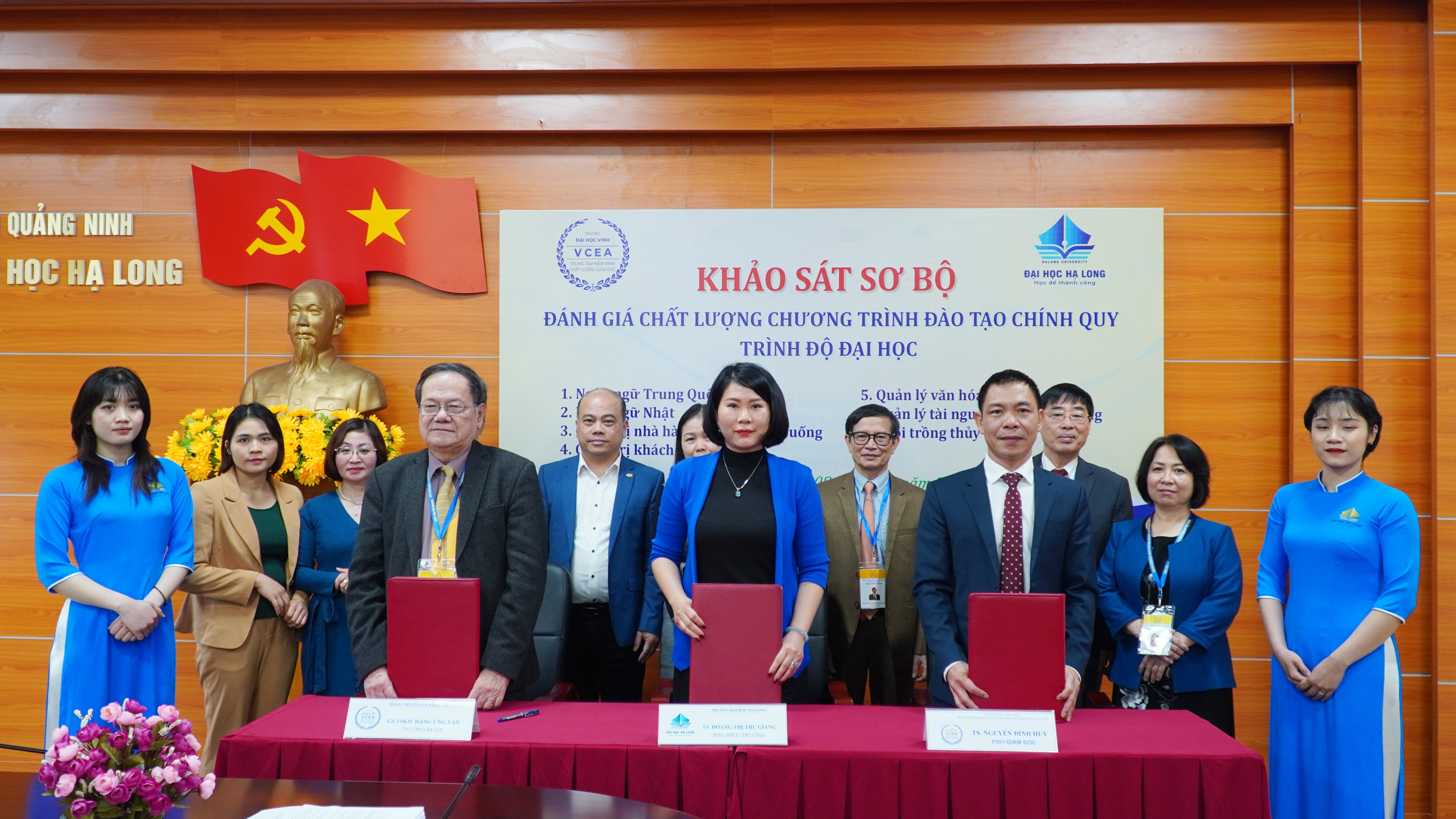 Ngày 08/02/2023, Đoàn đánh giá ngoài (ĐGN) của Trung tâm Kiểm định chất lượng giáo dục - Trường Đại học Vinh đã thực hiện khảo sát sơ bộ đánh giá chất lượng chương trình đào tạo trình độ đại học ngành: Ngôn ngữ Trung Quốc; Ngôn ngữ Nhật Bản, Quản trị nhà hàng và dịch vụ ăn uống; Quản trị khách sạn; Quản lý văn hóa, Quản lý Tài nguyên và môi trường; Nuôi trồng thủy sản của Trường Đại học Hạ Long.