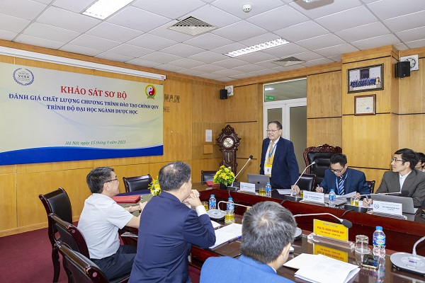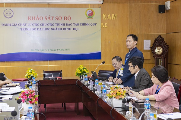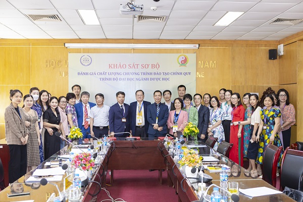 Tiếp và làm việc với Đoàn ĐGN, về phía Học viện Y - Dược học cổ truyền Việt Nam có PGS.TS Phạm Quốc Bình – Bí thư Đảng ủy, Chủ tịch Hội đồng trường, PGS.TS Nguyễn Quốc Huy – Giám đốc Học viện, PGS.TS Lê Mạnh Cường – Phó Giám đốc Học viện, PGS.TS Đoàn Quang Huy – Phó Giám đốc Học viện, TS. Nguyễn Thị Kim Ngân – Trưởng phòng Quản lý chất lượng, TS Nguyễn Văn Quân – Phụ trách khoa Dược và các thành viên Hội đồng tự đánh giá CTĐT chính quy đại học ngành Dược học cùng đại diện lãnh đạo các đơn vị thuộc Học viện, các tổ chức đoàn thể của Học viện.