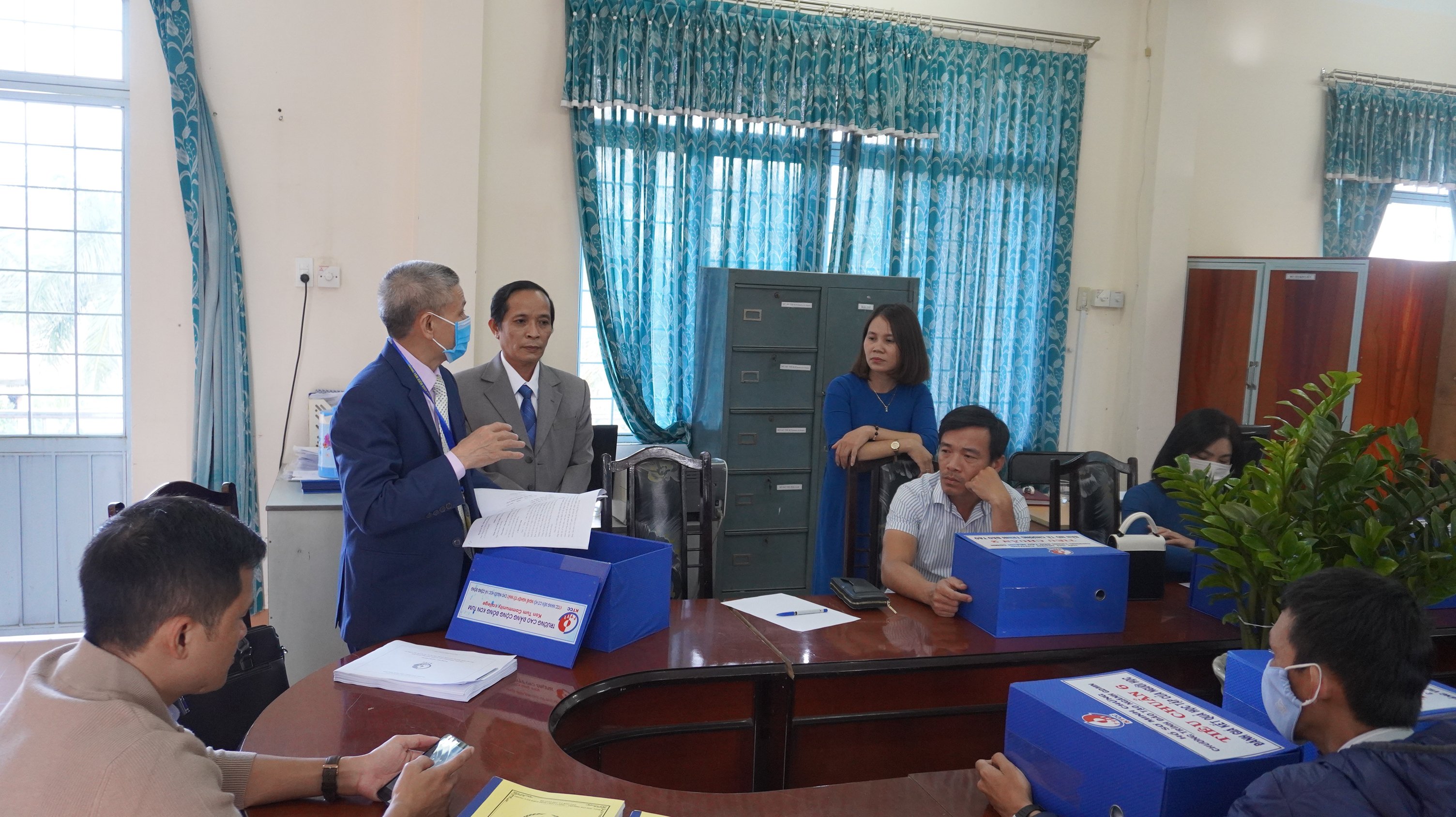 Tiếp và làm việc với Đoàn ĐGN, về phía Trường Cao đẳng Cộng đồng Kon Tum có TS BS Lê Trí Khải - Hiệu trưởng – Chủ tịch Hội đồng tự đánh giá chương trình đào tạo trình độ cao đẳng ngành Giáo dục Mầm non; ThS Nguyễn Bình Dân - Phó Hiệu trưởng trưởng – Phó Chủ tich Hội đồng; ThS Nguyễn Hữu Tuấn - Thư ký Hội đồng; Đại diện Đảng ủy, Hội đồng trường; Lãnh đạo Khoa Sư phạm; Đại diện các phòng chức năng và toàn thể thành viên Hội đồng tự đánh giá chương trình đào tạo trình độ cao đẳng ngành Giáo dục Mầm non.