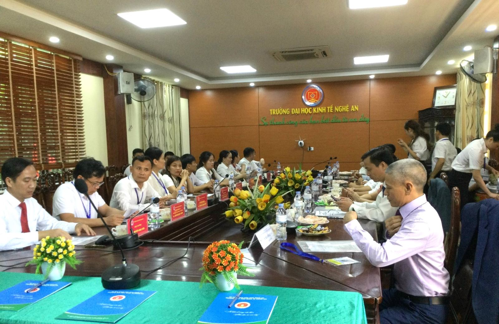Tiếp và làm việc với Đoàn ĐGN, về phía Trường Đại học Kinh tế Nghệ An có ThS. Nguyễn Đình Tường - Bí thư Đảng ủy, Chủ tịch Hội đồng trường; TS. Nguyễn Ngọc Hiếu - Hiệu trưởng Nhà trường, Chủ tịch Hội đồng tự đánh giá; TS. Trương Quang Ngân - Phó Hiệu trưởng, Phó Chủ tịch Hội đồng tự đánh giá; Cùng các thành viên đại diện Hội đồng trường, Ban Giám hiệu, Hội đồng Tự đánh giá, các khoa, trung tâm và phòng ban của Nhà trường.